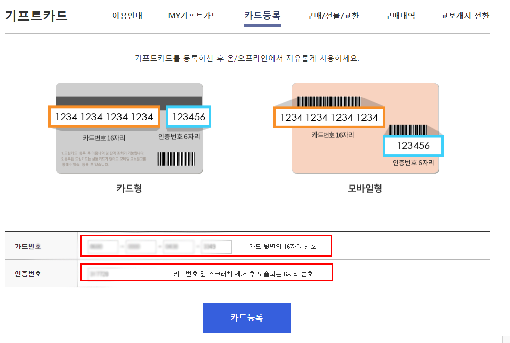 | 기프트카드 페이지 → 구매/선물/교환 메뉴 → 모바일 기프트카드 이미지 선택 → 교환 탭 선택 → 쿠폰번호 입력 → 교환하기 → MMS로 모바일 기프트카드 전송 → MMS로 전송된 카드번호와 인증번호를 카드등록 |