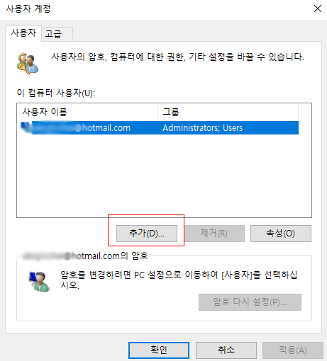 아래와 사용자 계정 창이 나타나면 추가 버튼을 클릭한다.