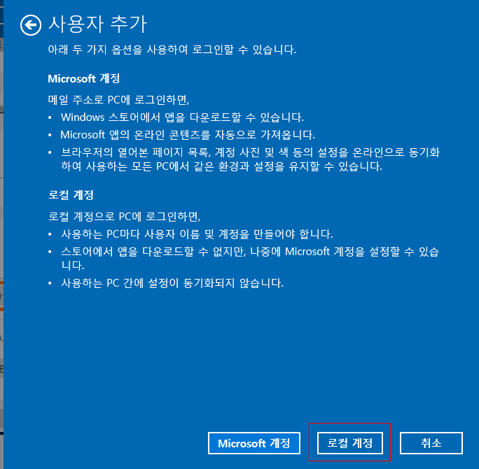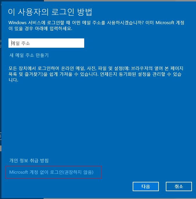 기존에 Microsoft 계정을 사용중이므로, 'Microsoft 계정없이 로그인(권장하지 않음)' 을 클릭하고 이 후 로컬 계정 버튼을 클릭하여 로컬 계정을 생성한다.