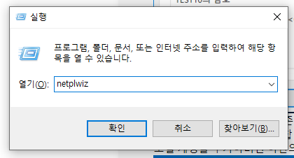 Windows 로고키 + R키를 누른 후 netplwiz 입력하고 확인을 클릭한다.