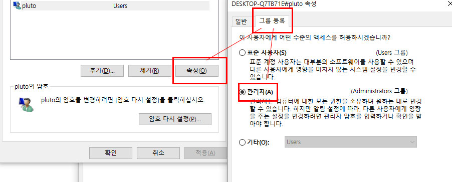 새 계정을 선택한 상태에서 속성을 클릭한 후 그룹 등록 탭에서 '관리자'에 체크하고 적용 - 확인 버튼을 누르면 추가 계정 생성이 끝난다.
