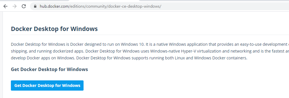 윈도우용 도커 데스크탑은 마이크로소프트 윈도우용 Community 버전이다. 도커 허브로부터 윈도우즈용 도커 데스크탑을 다운로드받을 수 있다. 본 튜토리얼은 Windows 10 프로, 엔터프라이즈에 도커를 설치하는 내용으로, 홈버전 사용자의 경우 Install Docker Desktop on Windows Home을 참고한다.