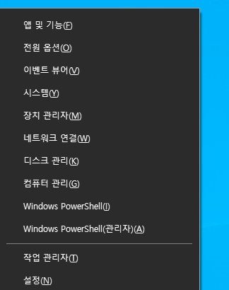 관리자 권한으로 파워셀을 실행한다. 윈도우즈키+x 를 누른 다음 Windows PowerShell(관리자)를 클릭한다.