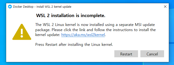 앞서 다운로드받은 Docker Desktop Installer.exe 파일을 실행한다. 설치 프로세스가끝나면 윈도우를 재시작한다.