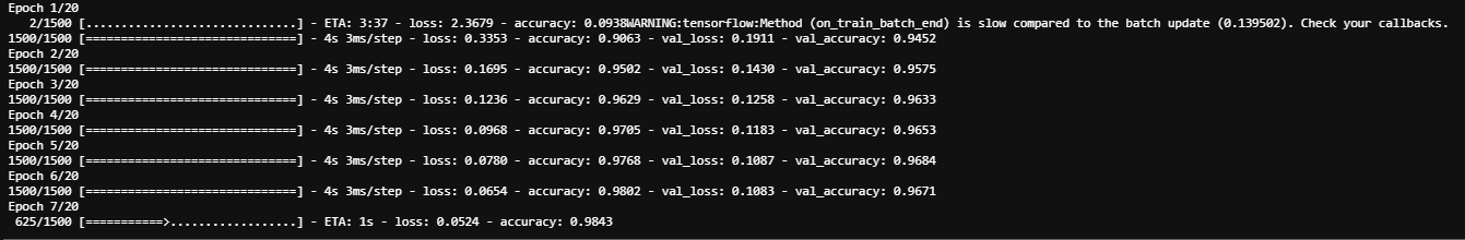 2/1500 [..............................] - ETA: 3:37 - loss: 2.3679 - accuracy: 0.0938WARNING:tensorflow:Method (on_train_batch_end) is slow compared to the batch update (0.139502). Check your callbacks.