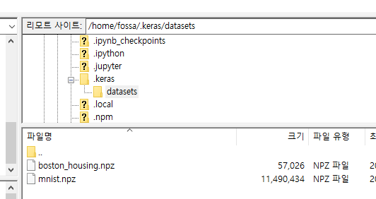다운로드된 데이터는 다음과 같이 '~/.keras/datasets/'의 위치로 다운로드 된다.