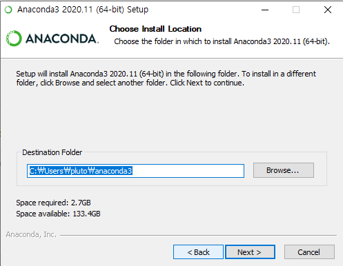 설치경로를 지정한다. “Just Me” 를 선택한 경우 기본적으로 “C:\Users\<username>\Anaconda3” 에 설치된다.