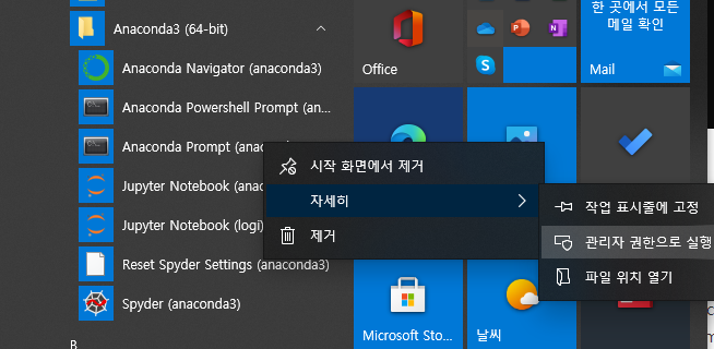 앞선 아나콘다 설치단계에서 “All users” 를 선택한 경우에는 다음과 같이 "관리자 권한으로 실행 Run as Administrator” 을 선택하여 클릭해야한다. 중요한 부분이다.