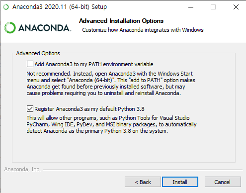 설치경로를 지정한다. “Just Me” 를 선택한 경우 기본적으로 “C:\Users\<username>\Anaconda3” 에 설치된다.