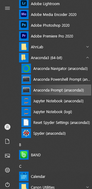 그러면 파이썬용 OpenCV 를 설치해보자. 다음과 같이 시작 메뉴에서 Anaconda prompt 를 클릭한다.