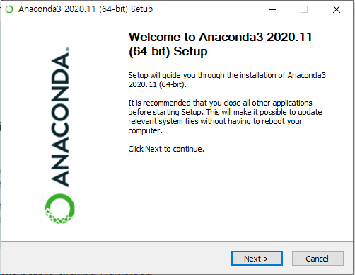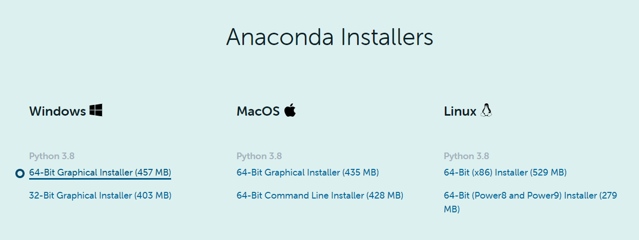 www.anaconda.com/products/individual 에서 최신 버전의 아나콘다 인스톨러를 다운로드받는다. 이하 윈도우 환경에서 진행할 예정으로 64비트 윈도우용 인스톨러를 다운로드받는다. 파이썬 버전은 3.8이다.
