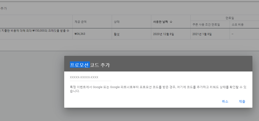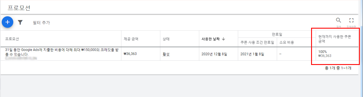 구글 애드워즈 광고를 집행하는 경우 가끔 프로모션으로 지출한 광고비만큼 쿠폰 형식으로 돌려주는 이벤트를 진행하는 경우가 있다. 이렇게 집행한 광고비가 있다면 아래 애드워즈 관리자 홈페이지 도구 및 설정 > 결제 > 프로모션 메뉴에서 프로모션으로 제공받을 수 있는 광고 쿠폰금액 및 현재까지 해당 금액을 사용한 현황을 조회할 수 있다.