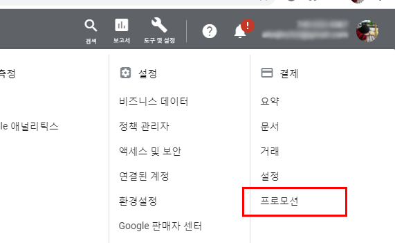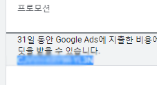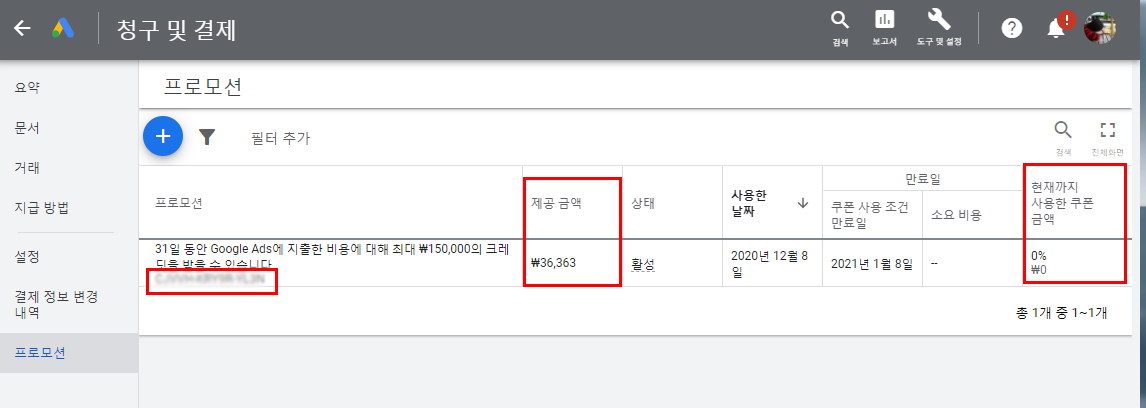 구글 애드워즈 광고를 집행하는 경우 가끔 프로모션으로 지출한 광고비만큼 쿠폰 형식으로 돌려주는 이벤트를 진행하는 경우가 있다. 이렇게 집행한 광고비가 있다면 아래 애드워즈 관리자 홈페이지 도구 및 설정 > 결제 > 프로모션 메뉴에서 프로모션으로 제공받을 수 있는 광고 쿠폰금액 및 현재까지 해당 금액을 사용한 현황을 조회할 수 있다.