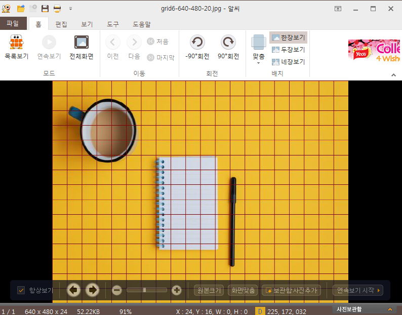 아래에서 보시다시피 불러온 이미지 위에 격자가 그려졌다. 원래 이미지 크기는 1920*1280 였는데 위에서 보듯이 인수로 입력받은 너비, 높이의 크기로 resize 를 수행한 뒤 격자를 그렸다. 여기서 주의해야할 점은 resize(width, height) 가 아니라 resize((width, height)) 라는 점이다.