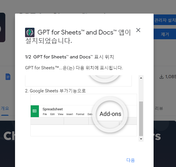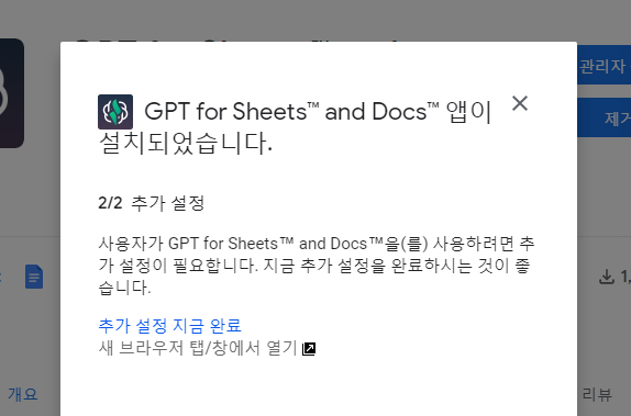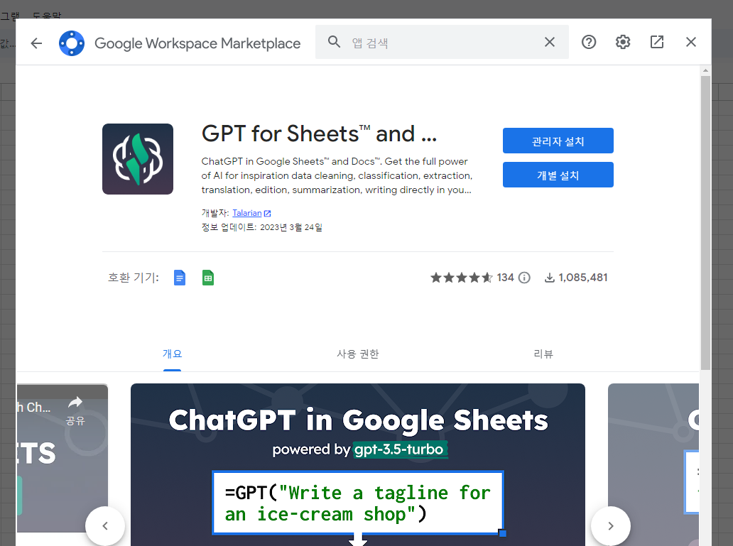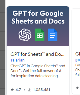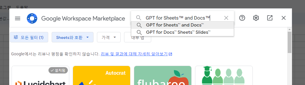 검색창에 GPT for Sheets .... 이렇게 검색하여 나오는 검색 결과중 GPT for Sheets™ and Docs™ 를 찾아 설치한다.