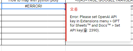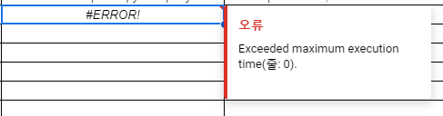 그런데 문제는 이게 아니라 다음의 Exceeded maximum execution time 에러다. 책의 내용대로 시트를 만들어 함수를 넣어서 실행하는 과정에서 주제에 적합한 컨텐츠를 작성하는 단계에서 다음과 같은 오류가 발생한다. 컨텐츠에 들어가는단어수를 줄여도 특별히 해결되는 것 같지는 않다.