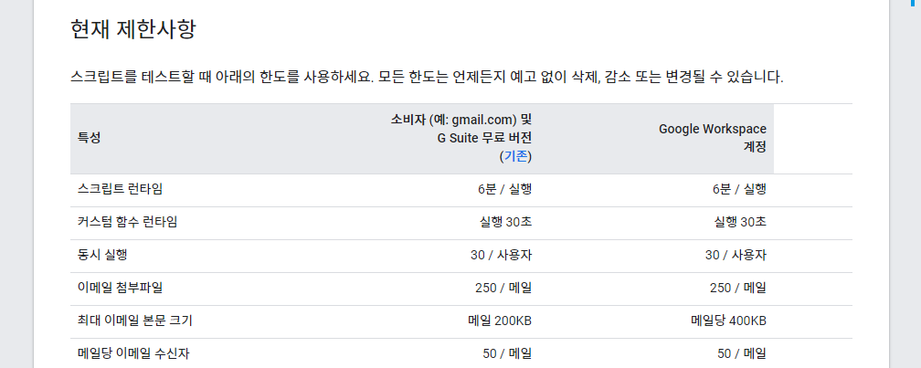 위의 에러는 다음의 제한사항에서 보듯이 커스텀 함수 실행시간 제한 30초때문이다. 현재 유료로 Google Workspace 를 사용중인데도 이 부분은 무료사용의 경우와 동일하게 제한이 있다. 이래서는 제대로된 실습이 불가능하다.