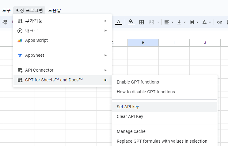 검색창에 GPT for Sheets .... 이렇게 검색하여 나오는 검색 결과중 GPT for Sheets™ and Docs™ 를 찾아 설치한다.