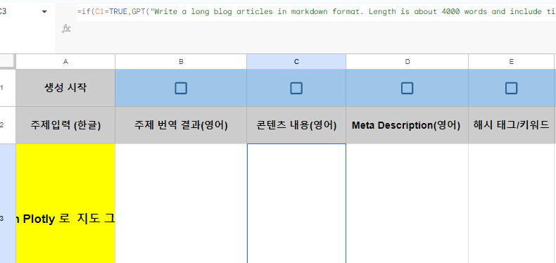 =if(C1=TRUE,GPT("Write a long blog articles in markdown format. Length is about 4000 words and include title and subtitles. Writing Style is Professional,Length is about 4000 words.The title of the blog is:",B3),"")
