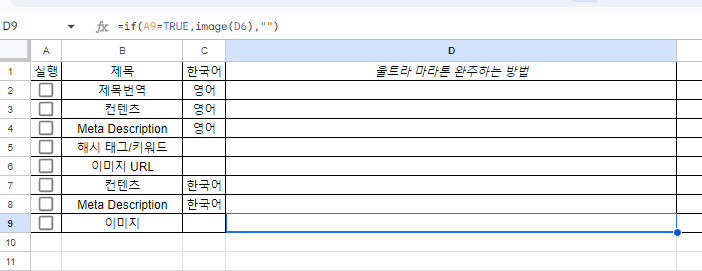 | 제목번역 | =if(A3=TRUE,GOOGLETRANSLATE(D2,"ko","en"),"") |