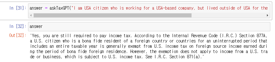 2) 이러한 임베딩을 통해 Internal Revenue Code (IRC) 데이터베이스에 질의가 던져지고, 최대 10개의 결과가 반환된다. 그리고 이러한 결과를 합쳐 하나의 텍스트로 만들게 된다.