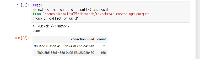 chroma-collections.parquet” 에는 앞서 생성한 2개의 컬렉션에 대응하는 2개의 레코드만 존재한다.