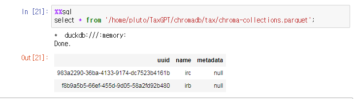 chroma-collections.parquet” 에는 앞서 생성한 2개의 컬렉션에 대응하는 2개의 레코드만 존재한다.