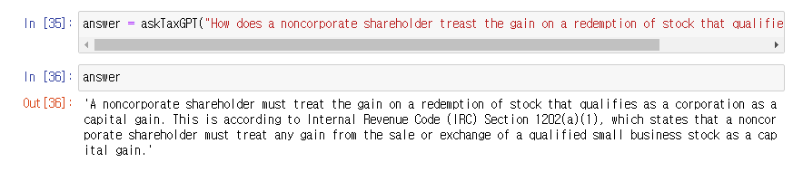 2) 이러한 임베딩을 통해 Internal Revenue Code (IRC) 데이터베이스에 질의가 던져지고, 최대 10개의 결과가 반환된다. 그리고 이러한 결과를 합쳐 하나의 텍스트로 만들게 된다.