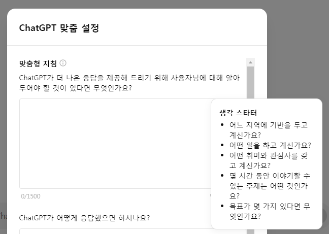 이 기능을 활용하면 사용자 정보와 응답 방식에 대해 미리 정보를 입력해두면 보다 일관되고 맞춤화된 정보를 제공받을 수 있으며, 매번 질의시마다 이러한 부분을 언급하지 않아도 되는 효과가 있다. 아래와 같이 크게 2개의 지침을 입력하게 된다.