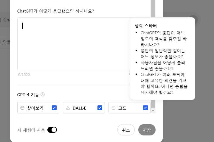 이 기능을 활용하면 사용자 정보와 응답 방식에 대해 미리 정보를 입력해두면 보다 일관되고 맞춤화된 정보를 제공받을 수 있으며, 매번 질의시마다 이러한 부분을 언급하지 않아도 되는 효과가 있다. 아래와 같이 크게 2개의 지침을 입력하게 된다.