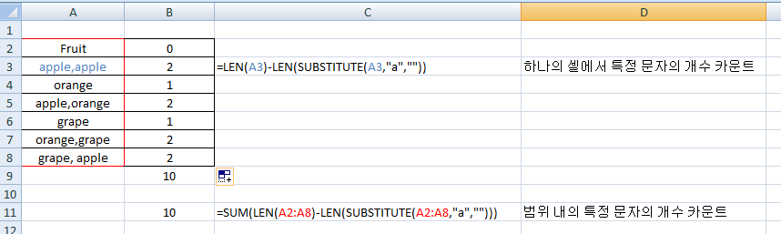 아래 예제에서 A3에서 문자 "a"의 개수를 셀려면 다음 수식을 입력하면 된다.