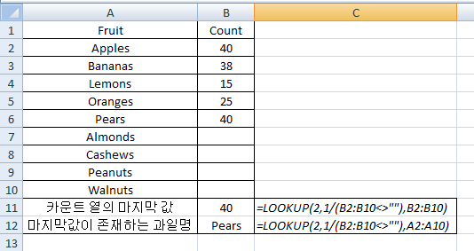 위 예제에서 카운트 열(B열)에 마지막 값이 존재하는 과일의 이름은 다음과 같이 찾을 수 있다.