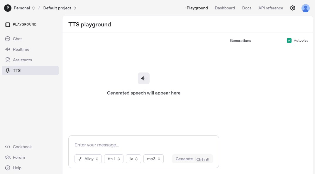 물론 아래와 같은 절차를 거칠 필요없이 아래와 같이 오픈AI 플랫폼 플레이그라운드에서 TTS 기능을 바로 이용할 수도 있습니다.