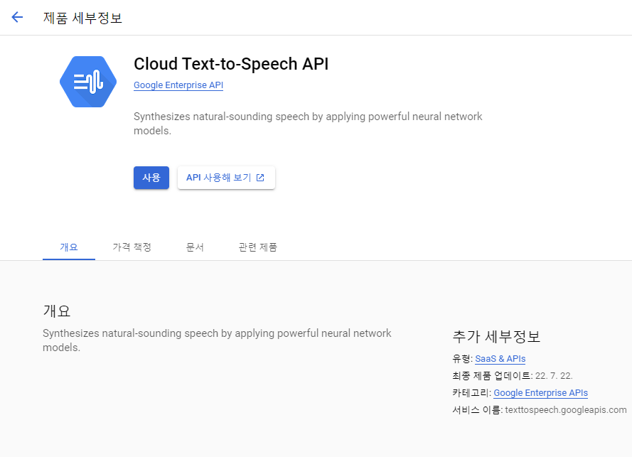 API 라이브러리 에서 Text-to-Speech API 검색 후 사용버튼을 클릭합니다.