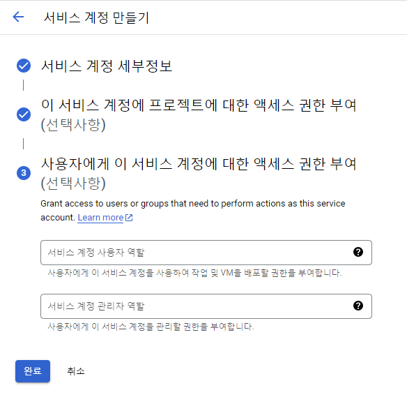 4) 서비스 계정(Service Account) 생성 및 인증 키(JSON)를 다운로드합니다.