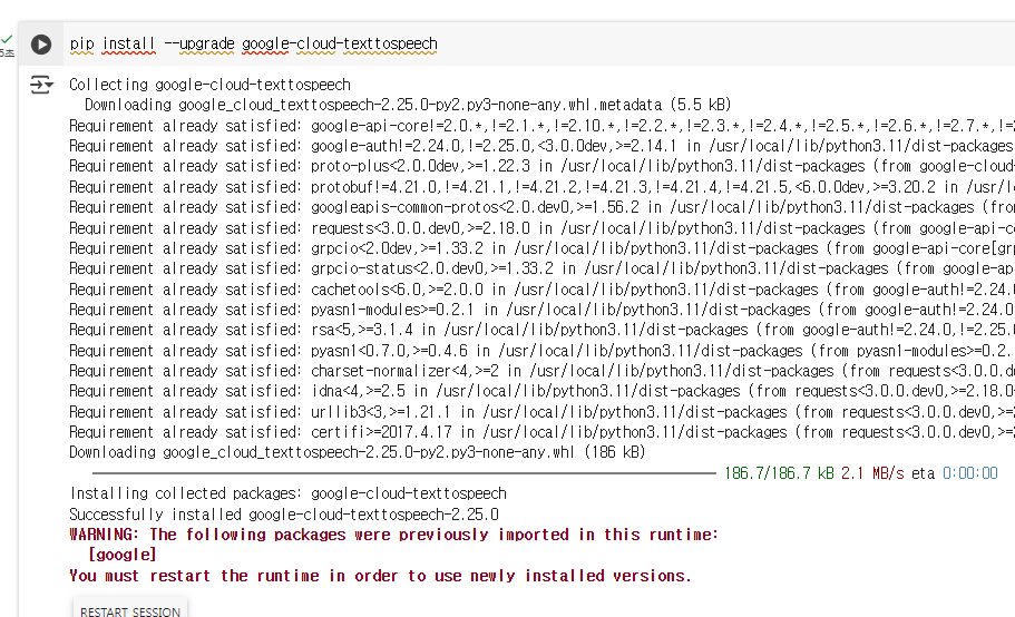 1) 먼저 Google Cloud SDK 및 TTS 라이브러리를 설치합니다. Colab에서 Google Cloud API를 사용하려면 다음과 같이 필요한 라이브러리를 설치해야 합니다.