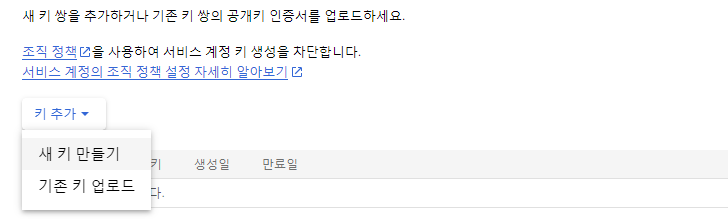 7) 해당 서비스의 세부정보관리를 누른 후 키 추가를 진행한다.