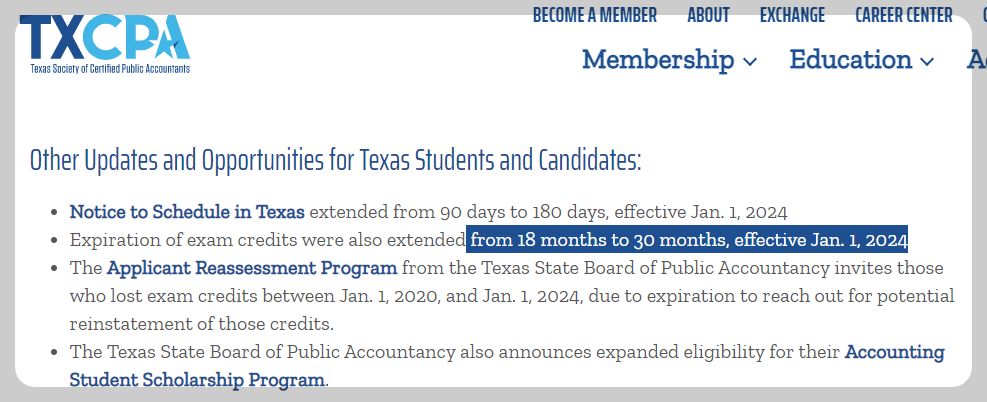 2) 텍사스주도 동일하게 2024년 1월 1일부터 합격 과목 유효기간을 30개월로 연장한다고 발표했습니다.