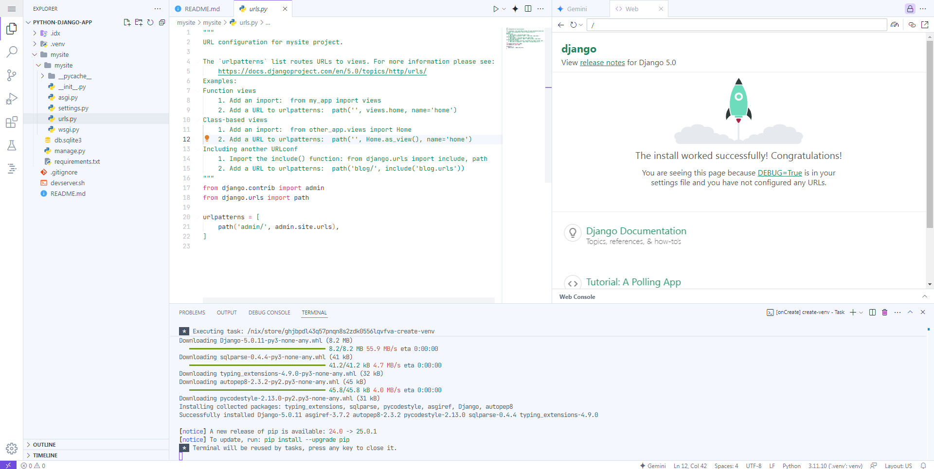 별도 설치없이 IDX에서 새 프로젝트 생성 시 Django 템플릿을 선택하면 자동으로 환경이 구축됩니다. 추가 설치나 설정 없이 개발이 즉시 가능합니다.