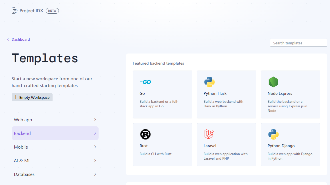 먼저 Django 프로젝트 설정합니다. Project IDX 홈페이지로 이동하여 로그인 후 See all templates → 를 클릭합니다.