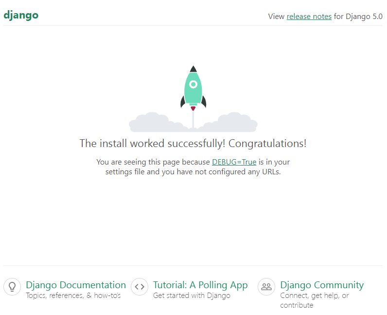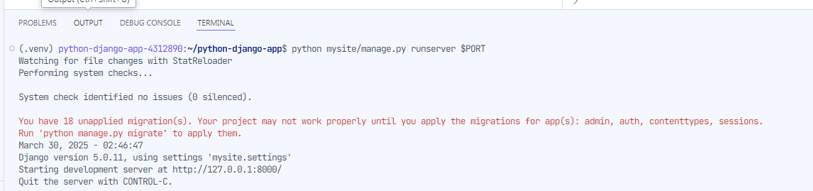 터미널에서 다음과 같이 python mysite/manage.py runserver $PORT 명령을 실행하면 아래와 같이 기본 웹페이지가 로딩되는 것을 확인하실 수 있습니다. 서버 실행 후, IDX에서 제공하는 미리보기 링크 (http://127.0.0.1:8000)로 실시간 확인이 가능합니다.