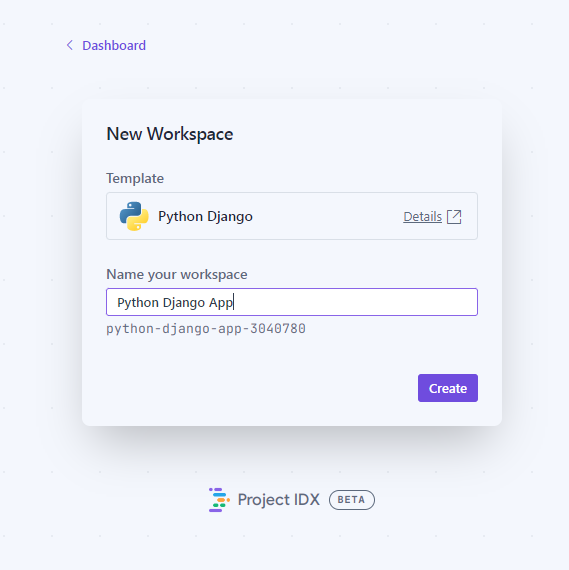 별도 설치없이 IDX에서 새 프로젝트 생성 시 Django 템플릿을 선택하면 자동으로 환경이 구축됩니다. 추가 설치나 설정 없이 개발이 즉시 가능합니다.