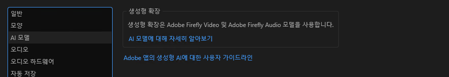 작업중 성능저하를 느끼고 해당 기능이 현재 필요없다고 판단되더라도 당장은 Media Intelligence 비활성화할 방법은 없는 것 같다. 먼저 환경설정 > AI 모델 탭으로 이동해봐도 생성형 확장에 대한 설명만 있을 뿐 비활성화 기능은 보이지 않는다.