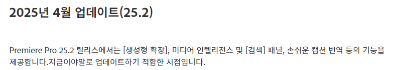 | Premiere Pro 25.2 업데이트: 생성형 확장, 미디어 인텔리전스, 캡션 번역 등 주요 기능 개선 (0) | 2025.04.12 |