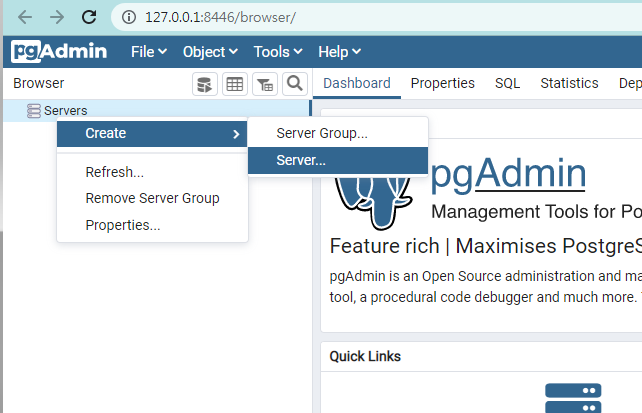 설치 후 해당 아이콘을 클릭하면 웹브라우저가 열리면서 다음 페이지로 이동한다. 여기서 Server > Create > Server 를 선택해서 postgreSQL 이 선택된 서버를 추가한다.