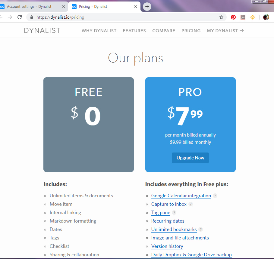 workflowy https://workflowy.com/ 를 지난 달까지 사용하다 이번 달 들어 dynalist https://dynalist.io/ 로 옮겨탔습니다. 한 달 정도 workflowy 를 사용해보니 유용한 앱이라는 생각은 들었습니다. 무료 버전은 쓸 수 있는 목록에 제한이 있어 유료로 사용하기로 마음먹은 상황에서 돈을 더 주더라도 괜찮은 걸 선택해야겠다는 생각이 들었습니다. 그래서 workflowy 외에 어떤 것이 있는지 찾아보던 중 dynalist 를 알게 되었습니다. 일단 써봐야 알겠지만 한 눈에 보기에도 workflowy 보다는 풍부한 기능을 가진 것으로 보였습니다. 물론 월사용료도 그만큼 더 비싸긴했지만요.