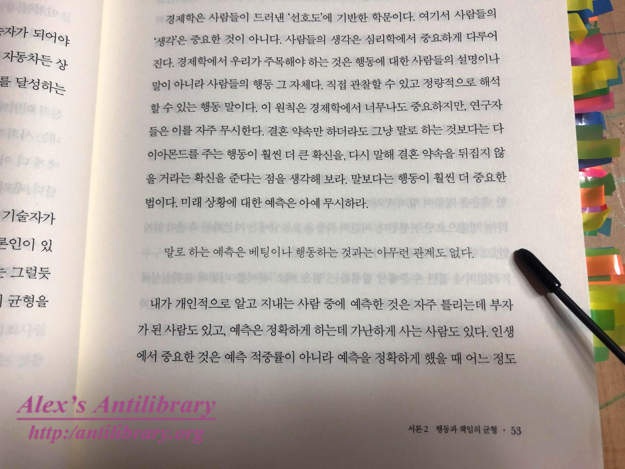 - 경제학은 사람들이 드러낸 '선호도'에 기반한 학문이다. 여기서 사람들의 '생각'은 중요한 것이 아니다. 경제학에서 주목해야 하는 것은 행동에 대한 사람들의 설명이나 말이 아니라 사람들의 행동 그 자체다. 직접 관찰할 수 있고, 정량적으로 해석할 수 있는 행동말이다. 말보다 행동이 훨씬 더 중요한 법이다. 미래 상황에 대한 예측은 아예 무시하라. 인생에서 중요한 것은 예측 적중률이 아니라 예측을 정확하게 했을 때 어느 정도의 성과를 내느냐다. 예측이 틀리더라도 아무런 비용이 발생하지 않는다면 걱정할 필요가 없다. 이런 경우, 오히려 시행착오를 통해 경험이 쌓일 수 있다.