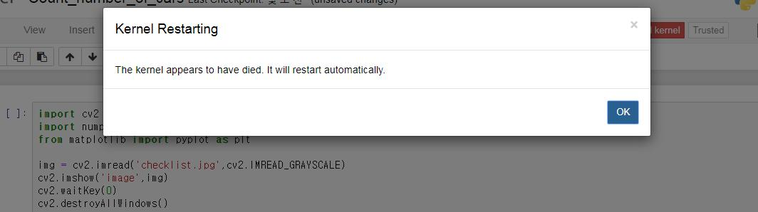 이 경우 다음과 같이 코드를 수정하여 실행하면 이미지를 볼 수 있다. https://stackoverflow.com/questions/43943333/cv2-imshow-crashes-kernel