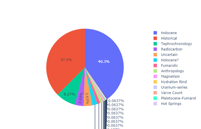 위 그래프에서 볼 수 있듯이 대부분의 화산의 상태는 Holocene 또는 Historical 이다.