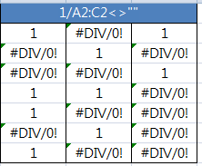 1 을 앞서 반환된 배열로 나눈 결과로 새로운 배열을 만든다. 그러면 아래와 같이 divide by zero errors (#DIV/0!) 로 구성된 배열을 만들 수 있다. 이 배열이 바로 2번째 인수인 Lookup Vector 이다.